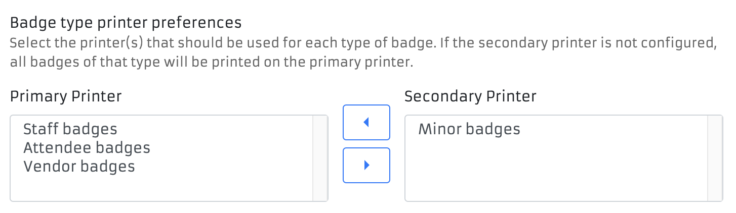 You can configure which badge type is printed on which printer by selecting the badge type from the menu and using the arrows to move between the two printers listed.
